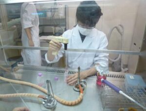 細胞のいないフラスコの側面かへパスツールピペットをあてます。