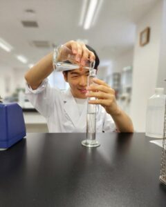 三角フラスコの下に手を添えて、攪拌します。