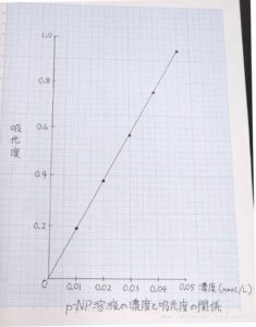 測定値をまとめて、溶液の濃度と吸光度の関係をグラフにします。