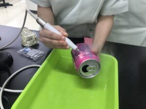 始めは力加減や角度が上手く出来ず、缶の表面も傷つけてしまう学生もいましたが、最後は加減がわかりキレイにマニキュアだけを削れました!!