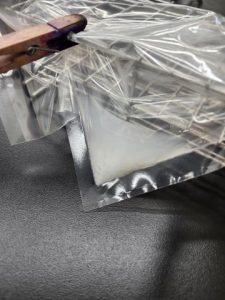 2g測り、滅菌生理食塩水と共に袋に入れて、ストマッカーで処理します。