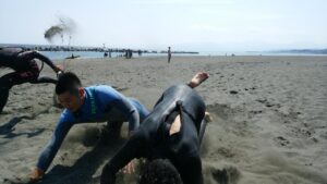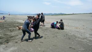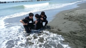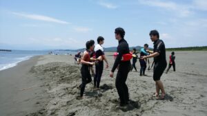 普段は何気なく搬送をしていますが、足元が不安定な砂浜では苦労している場面も見受けられました。