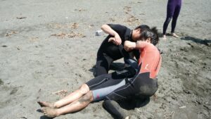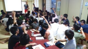 また、海洋実習の夕食後には毎年ナイトセミナーがあり、今年も東海大学病院の中川儀英先生と現役のライフセーバーの方々から貴重な講義をしていただきました。