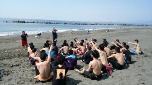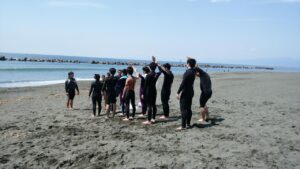 湘南海岸と富士山のみえる絶景の中、海洋実習がスタートしました。