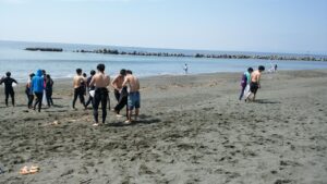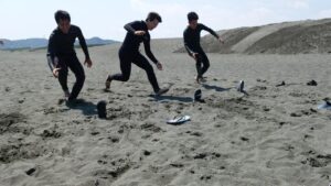 ビーチといえば「ビーチフラッグス!!」ということで、反射神経のトレーニングも兼ねて競技開始!!!