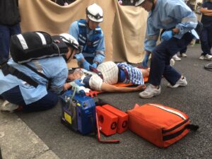 自転車と乗用車の接触事故では、傷病者が妊婦であることがわかり、実施隊の学生達は胎児の様子や母体の観察を入念に行っていました。