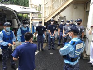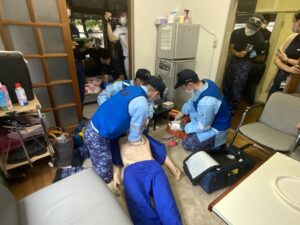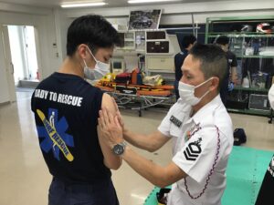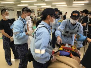 午後には、海自学生さんと湘央学生の混合救急隊を形成し、隊として想定練習を行いコミュニケーションをとります。