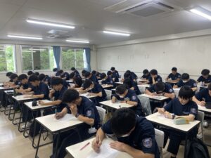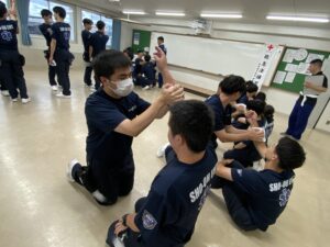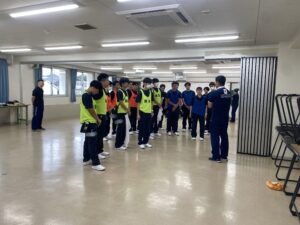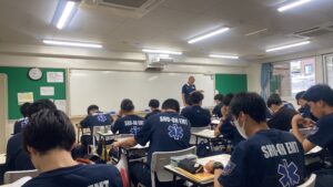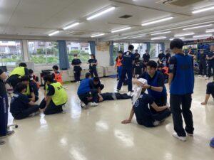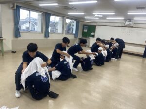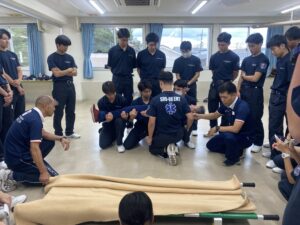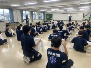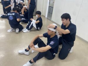 最後に座学の試験、三角巾を使用した傷の手当ての試験を実施し