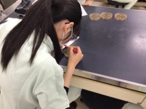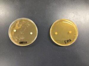 寒天培地にできる阻止円径を測定し、どの薬剤がどのくらい効果があるのかを判定する方法になっています。