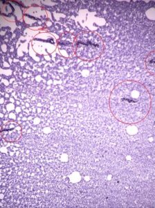 こちらは染色したミクロフィラリアです。(赤丸の中にミクロフィラリアがいます)